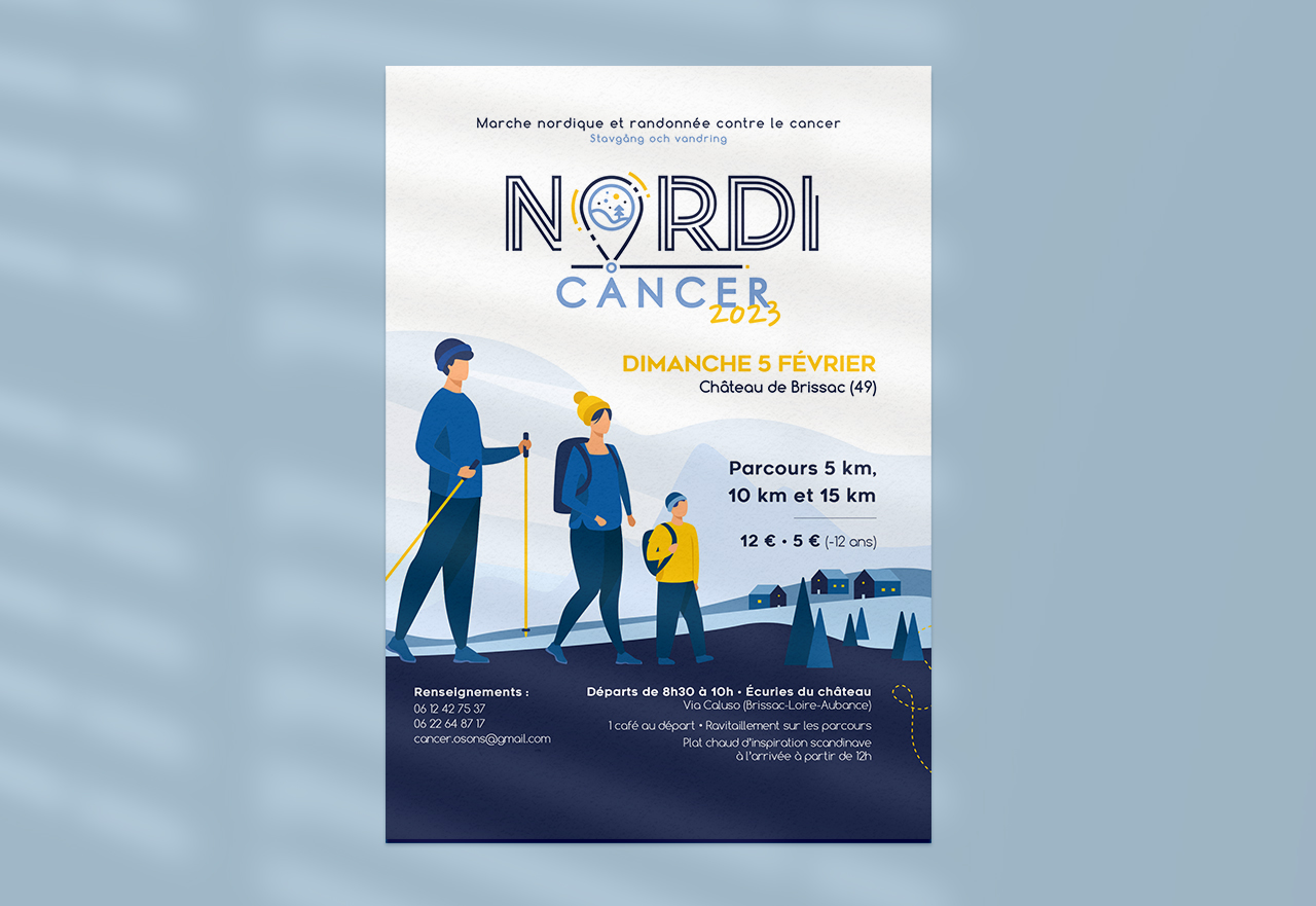Le mot “Nordi” représentant le cheminement et l’itinéraire à suivre, le pointeur, qui remplace le O (sans impacter la lisibilité) symbolise le but à atteindre, le point de rendez-vous. Les montagnes en son centre sont un clin d’oeil à l’aspect géographique lié à cette activité. Le trait sous le pointeur permet d’asseoir celui-ci, et structure le mot “cancer”. L’ensemble de la composition se veut dynamique et suggérant le voyage.