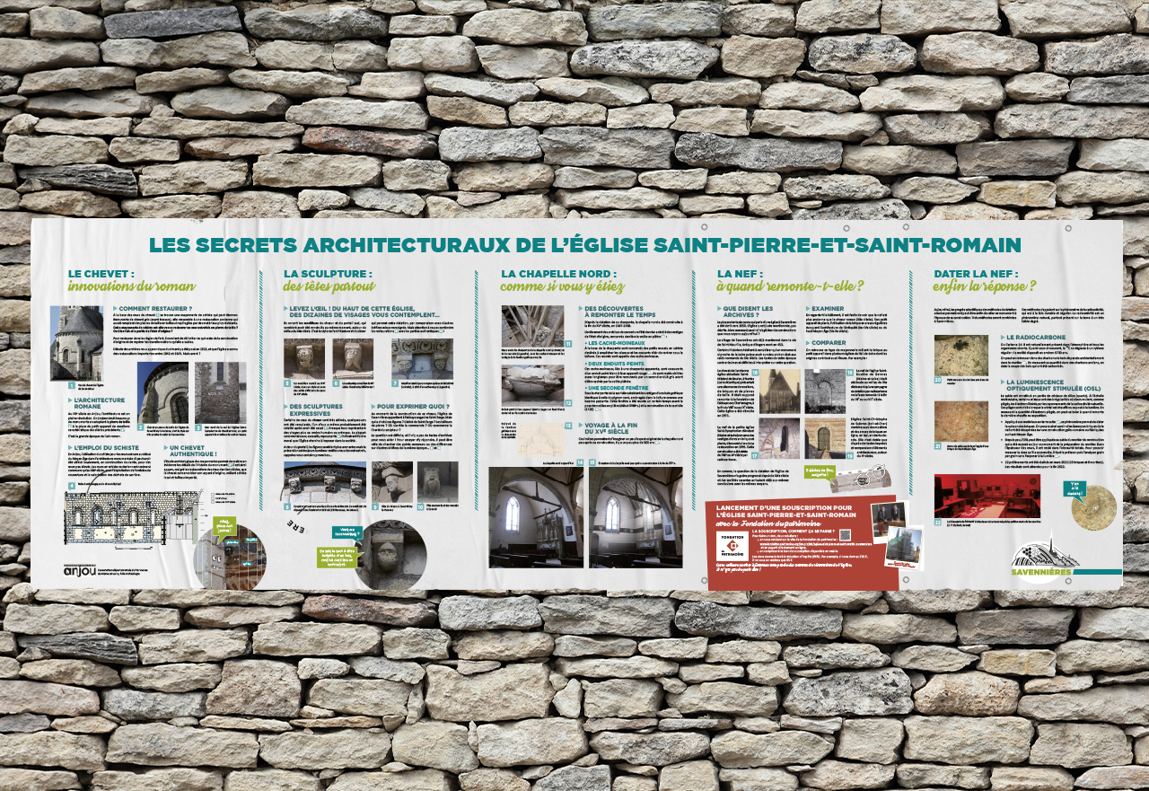Une bâche de plusieurs mètres de longueur a été réalisée par l’agence, mettant en scène le travail de l’historien Arnaud Remy, détaillant les secrets architecturaux du bâtiment emblématique de la commune.